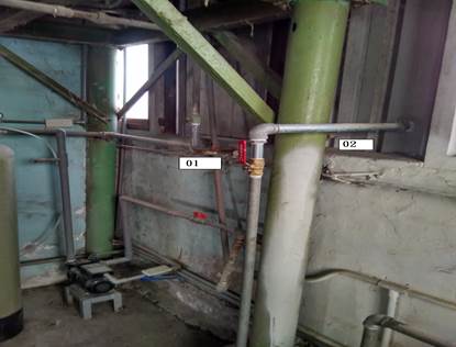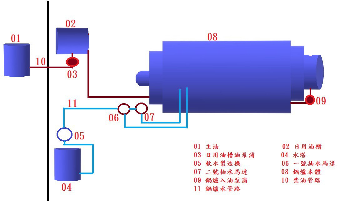 01:水塔 07:無用之止水開關 02:水位進入水管 08:軟水樹脂容器 03:舊式單柄止水開關閥 09:鹽桶加水器 04:新裝單柄止水開關閥 10:鹽桶 05:入水塔管路單柄止水開關閥 11:鍋爐房及軟水機總電源開關 06:軟水機控制系統 01:一號抽水泵浦止水閥開關 08:一號入鍋爐水路系統旋塞閥開關 02:二號抽水泵浦止水閥開關 09:二號入鍋爐水路系統旋塞閥開關 03:一號抽水泵浦馬達 10:二號後端止水閥 04:二號抽水泵浦馬達 12:二號前端止水閥 05:一號前端逆止閥 13:一號管路 06:保養用接水開關 14:二號管路 07:一號後端逆止閥 開啟流程: 開啟水塔止水閥開關→開啟一號抽水泵浦止水開關→開啟二號抽水泵浦止水開關→開啟一號入鍋爐水路系統旋塞閥開關→開啟二號入鍋爐水路系統旋塞閥開關