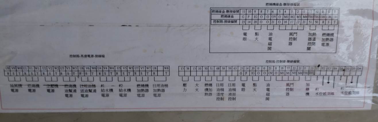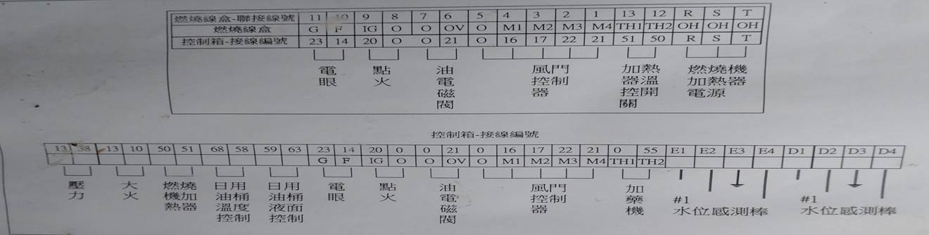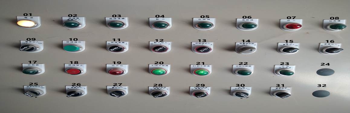 編號 開關名稱 按鍵種類 編號 開關名稱 按鍵種類 編號 開關名稱 按鍵種類 01 電源指示燈 指示燈 02 燃燒機運轉切入指示燈 指示燈 03 燃燒運轉指示燈 指示燈 04 點火指示燈 指示燈 05 低燃燒指示燈 指示燈 06 高燃燒指示燈 指示燈 07 熄火指示燈 指示燈 08 抽風機指示燈 指示燈 09 控制箱主電源切入 2P 按鍵開關 10 燃燒操作按鈕 按鍵式 11 燃燒運轉開關 3P 按鍵開關 12 點火切入開關 3P 按鍵開關 13 低燃燒切入開關 3P 按鍵開關 14 風量調節器開關 3P 按鍵開關 15 熄火警報切入開關 2P 按鍵開關 16 抽風機運轉切入開關 2P 按鍵開關 17 加熱器指示燈 指示燈 18 燃燒停止開關 按鍵式 19 低水位指示燈 指示燈 20 1 號給水泵浦指示燈 指示燈 21 2 號給水泵浦指示燈 指示燈 22 油桶加熱器指示燈 指示燈 23 油桶送油幫浦指示燈 指示燈 25 溫度控制切入開關 2P 按鍵開關 26 燃燒機運轉切入 3P 按鍵開關 27 低水位警告切必開關 2P 按鍵開關 28 1 號給水泵浦轉切入 3P 按鍵開關 29 2 號給水泵浦運轉切入 3P 按鍵開關 30 油桶加熱器切入 2P 按鍵開關 31 油桶送油幫浦切入 2P 按鍵開關
