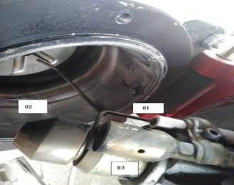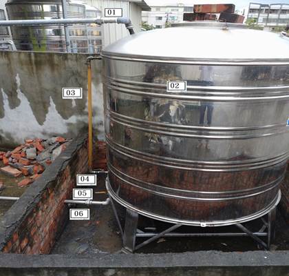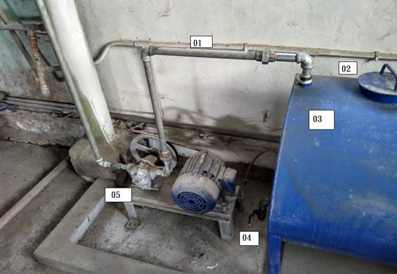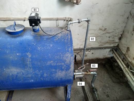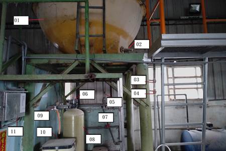 01:入日用油槽管路 02:日用油槽上蓋 03:日用油槽主體 04:日用油槽底部排放閥開關 05:抽油泵浦 01:油位計控制端 02:入鍋爐抽油泵浦管路 03:入鍋爐管路止油閥開關 04:日用油槽加熱器