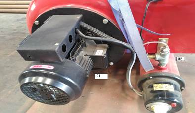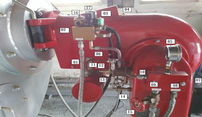 01:空氣風管 02:燃燒機主體 03:瓦斯電磁閥 04:觀火孔 05:燃料壓力錶 06:風壓管 07:風門控制器 08:入油孔 09:回油孔 10:空氣孔 11:加溫出油管 12:風量調節器 13:入霧化噴嘴管 14:油量調節器(桿) 15:油量調壓閥 16:空氣電磁閥 17:油電磁閥 01:送風機馬達 02:油穩溫器 01:電火眼