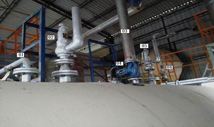 01:鍋爐蒸汽壓力錶 02:鍋爐壓力調節器 03:鍋爐燃燒大小火調節器 01:水位器出水管 02:前端安全閥 03:主蒸汽排汽管 04:主蒸汽閥 05:後端安全閥 06:空氣排放閥 01:人孔蓋