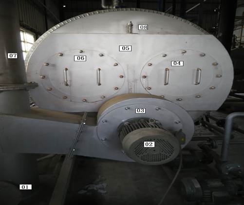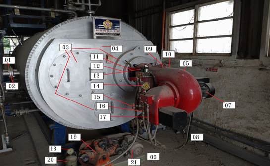 01:煙囪清掃孔 02:鼓風機馬達 03:鼓風機固定盤 04:右側火室蓋 05:後火室 06:左側火室蓋 07:煙囪 08:爆發門 01:主體入水位計閥 02:主體入水位計閥 03:前火室蓋 04:前火室 05:燃燒機 06:空壓機 21:空壓機馬達 20:空壓機集氣罐 18:空壓機壓力錶 19:空壓機壓縮缸 備註:鍋爐底部構造.有清掃孔及底部排放孔和支架及支撐架..而不列入進去.