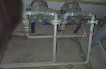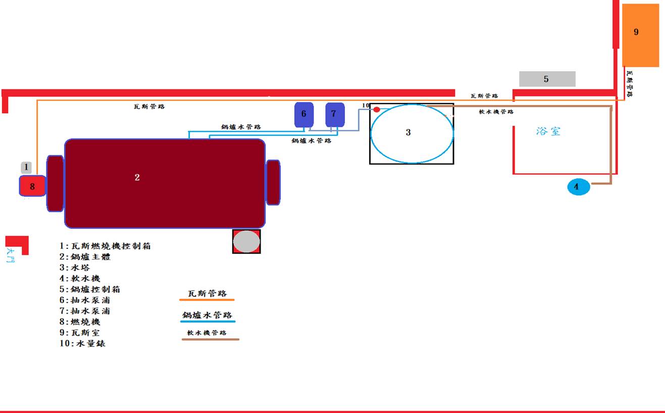 01:水塔出水閥門開關 02:水塔出水閥門開關 03:管路 01:1 號抽水泵浦閥門開關 02:2 號抽水泵浦閥門開關 03:1 號抽水泵浦 04:2 號抽水泵浦 05:管路 開啟流程: 開啟水塔止水閥開關→開啟一號抽水泵浦止水開關→開啟二號抽水泵浦止水開關→開啟一號入鍋爐水路系統旋塞閥開關→開啟二號入鍋爐水路系統旋塞閥開關