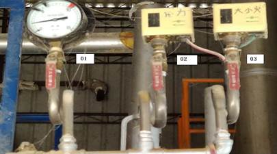 01:鍋爐蒸汽壓力錶 02:鍋爐壓力調節器 03:鍋爐燃燒大小火調節器 01:水位器出水管 02:前端安全閥 03:主蒸汽排汽管 04:主蒸汽閥 05:後端安全閥 06:空氣排放閥 01:人孔蓋