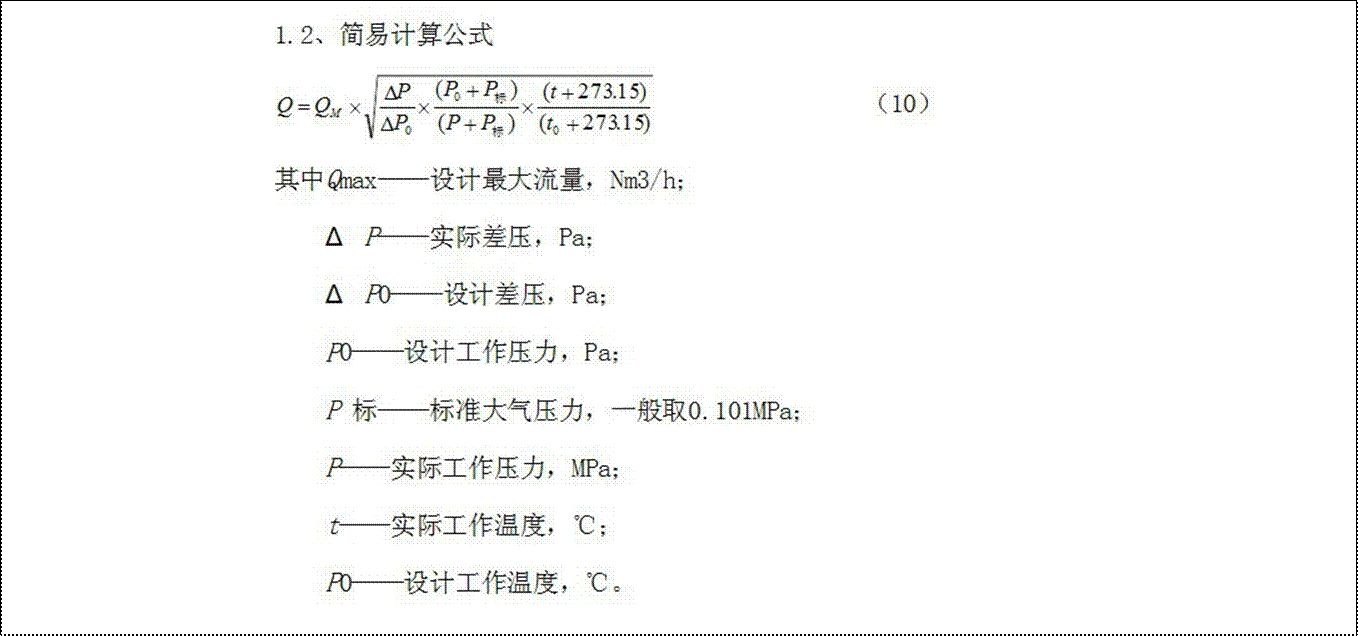 增加温度、压力补偿。在孔板通用公式中,增加压力、温度补偿的流量计算公式关键是对介质在工况下的密度进行处理,此外还需要孔板设计说明书上的流量系数、孔板开孔直径、膨胀系数、工况密度等参数,公式比较复杂;笔者经过大量的数据统计获得的简易公式则简单得多,只要有孔板的设计最大流量、设计差压和设计压力,即可准确获得实际流量值。