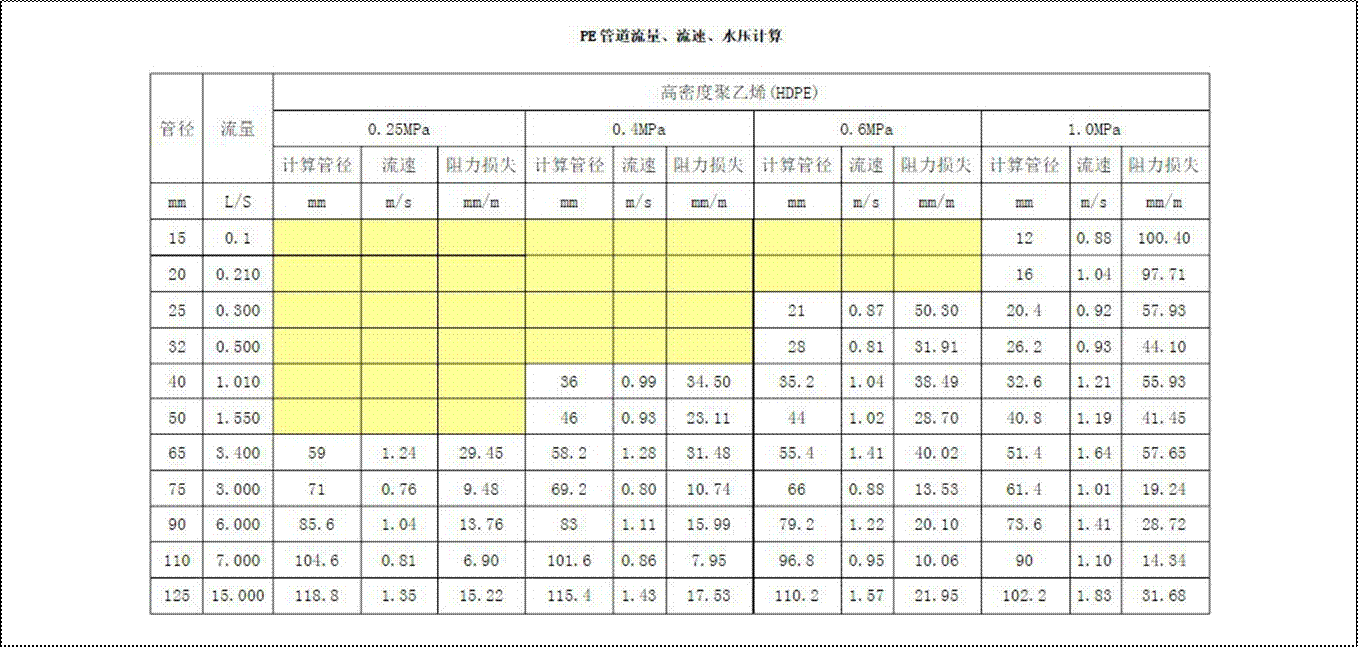 PE 给水管流量计算对照表