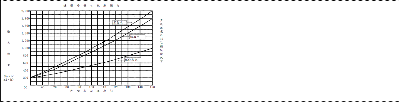 爐體保溫良否直接影響到鍋爐效率,保溫正常則爐體表面平均溫度將不超過室溫 30℃以上,而鍋爐房風速及外氣溫度條件也會影響爐體表面熱散失量,爐壁散熱損失如下圖所示。