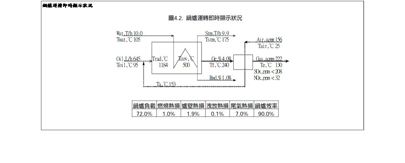 Ex:給水溫度 32℃、蒸汽壓力 5 kg/cm2、蒸汽量 7.9 噸/小時、耗油量 615 L/hr。