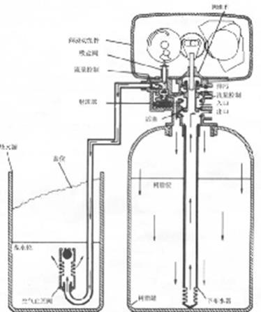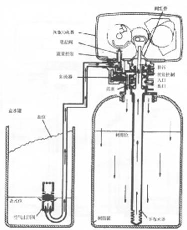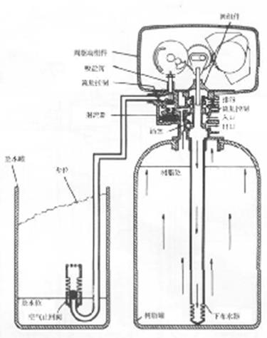 硬水从入口进入控制阀,部分硬水经下部活塞槽,射流器喉管,吸盐阀及吸盐限流垫圈,注入盐罐。其全硬水经下部活塞槽至罐顶,向下穿过树脂层,变成净化水,进入下布水器,沿中心管向上,并从阀体出口排出。